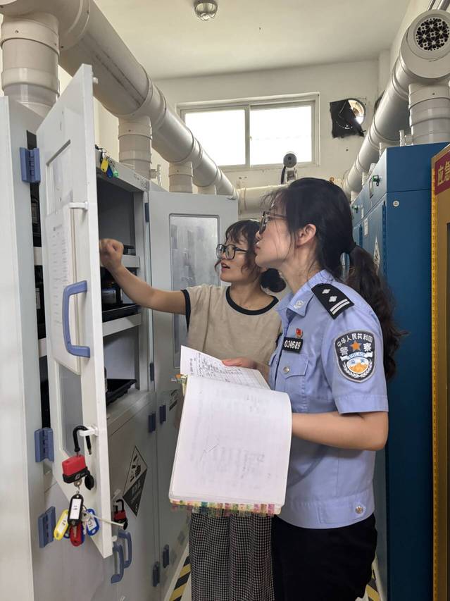 检查过程中,王胤警官细致核查了易制毒、易制爆化学品的入库出库台账与实际库存情况,确认账物相符、管理规范。全面查验了试剂库的消防设施与监控系统,确保各类安防设备运行正常。王警官对我校化学试剂库的安全管理工作给予充分肯定,并强调要持续强化安全意识,严格落实危险化学品管理制度,为新学期师生安全与校园稳定筑牢防线。